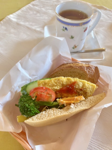 モーニングセット¥1,150を注文。パンが一人3枚つき、オムレツやハム、サラダを挟んで食べます。