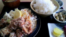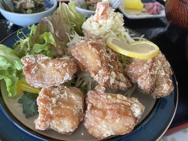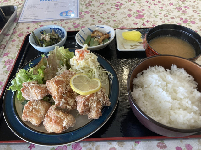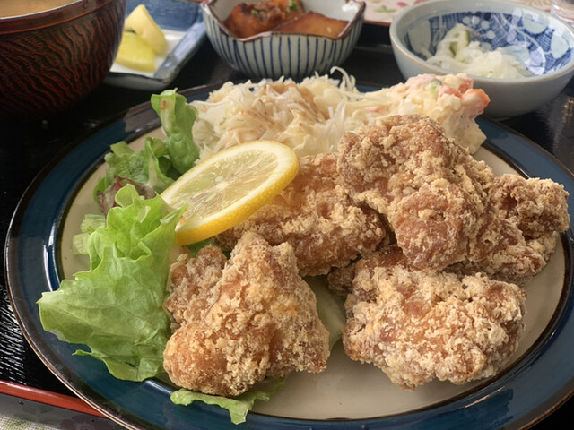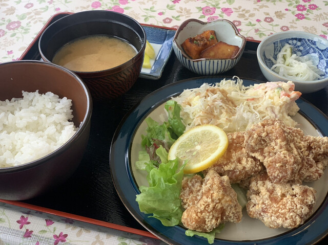 ボリューム感ある唐揚げに味噌汁、小鉢2つ、お腹いっぱいになりました。