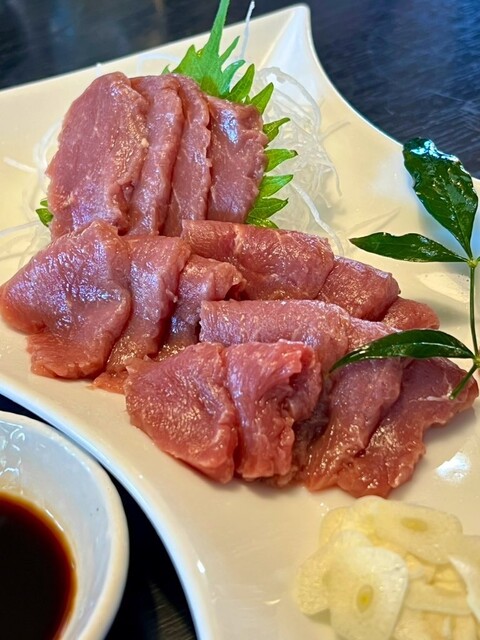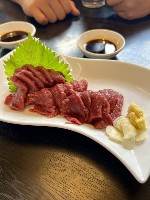 はじめに馬刺しが届く。馬刺しににんにく片と生姜を乗せてかなり甘めの醤油でいただく。これはこれで美味いが、しょっぱい醤油で食べたい。