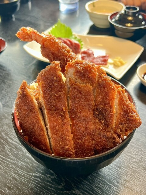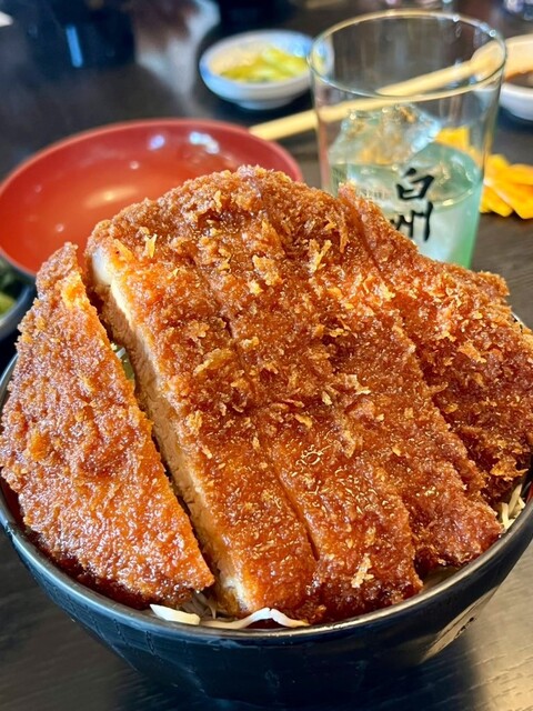 いつも注文するのはロースソースかつ丼と白州ハイボール。かつ丼はご飯大盛りにするとかなりのボリュームになるため、普通盛り。あと馬刺し大。白州ハイボールは安く飲めるのも良い。