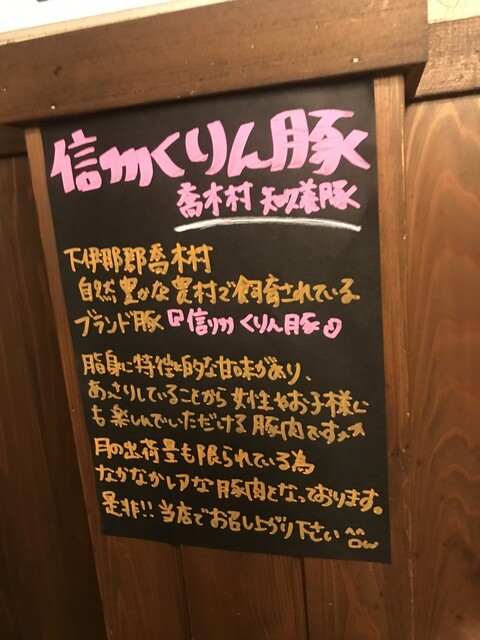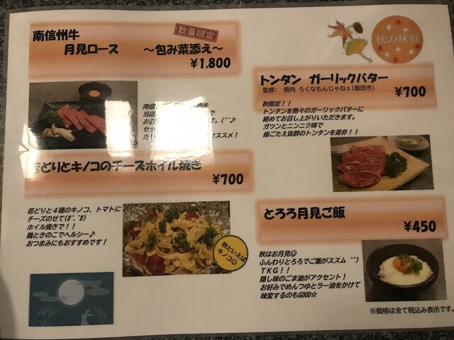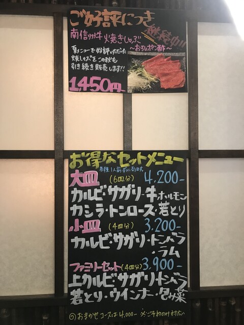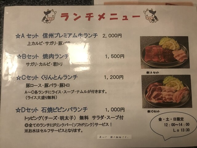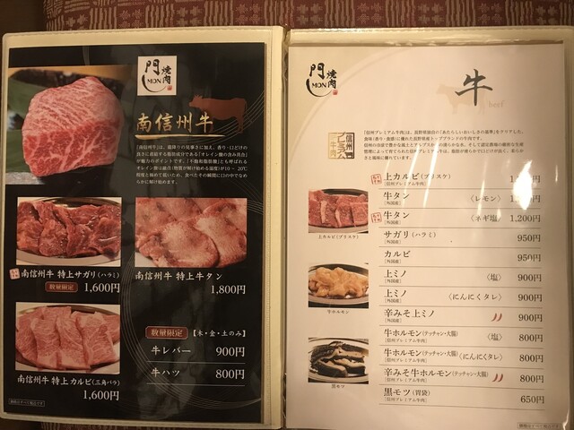 品書きは信州プレミアム牛と豊丘村のくりん豚が2枚看板、その他ファミリーなどに便利な大皿盛り合わせセットなどもラインナップされています。ドリンクは飲み放題メニューが多く、単品ベースではそんなにこだわりなさそうな感じです。値段は銘柄の信州プレミアム牛になるとオーバー1,000円ですが、他はアンダー1,000円主体で、本格焼肉系ではこなれた値段だと思います。