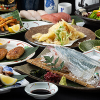 当店自慢の活きイカ姿造りをはじめ、ジューシーな牛タン葱焼きや芝海老とあんこうの唐揚げ、月見つくね焼き、〆は寿司2貫と厳選食材をふんだんに盛り込んだ大満足のコースです!忘年会や新年会、歓迎会や送別会、接待等の各種宴会から、ご友人やご親戚のお集まりまで、各種飲み会などに是非ご利用ください。