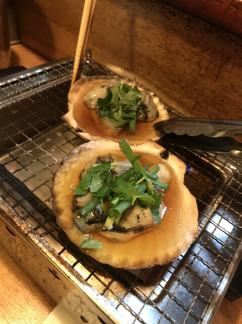 貝づくし焼き物盛り合わせ、生牡蠣、牡蠣酢、他ドリンクをいただきました。