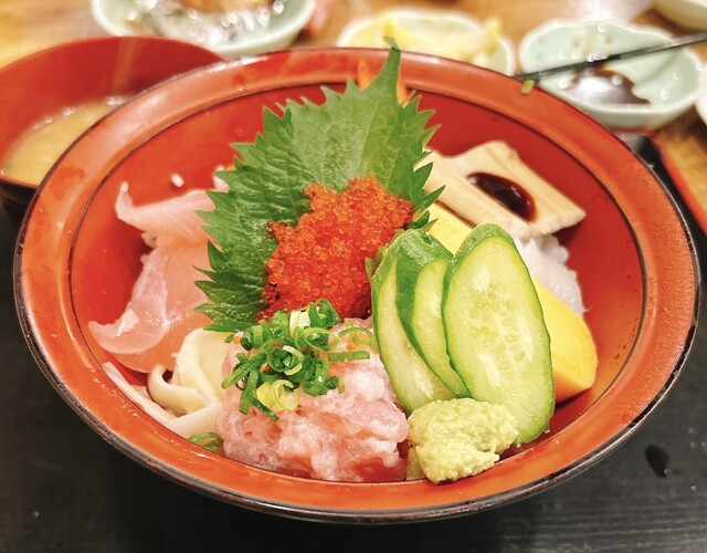 マグロやサーモン、イクラといったネタが溢れんばかりに乗った名物「ぶっかけ寿司こぼれ盛り」(1,980円)や、豪快な刺盛り(8点盛り/一人前1,280円)もオススメ。