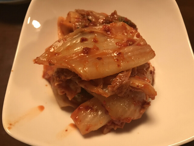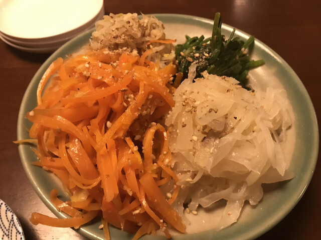 メニューはすごくシンプル。まずナムル。もやし、大根、にんじん、ナス。お肉は2名なら2人前ずつ注文の決まりらしく、ロースとカルビそれぞれ2人前。お肉はすごく美味...