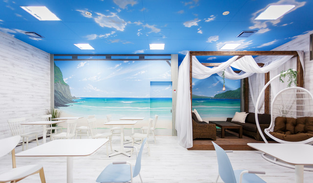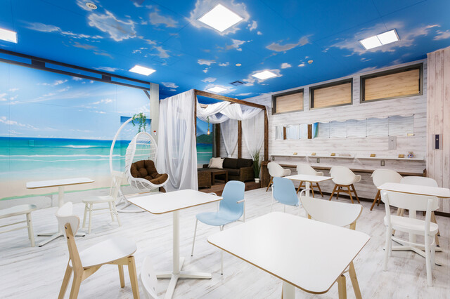 店内は、「日本一美しい海」と呼ばれる五島の高浜海水浴場をイメージし、開放感あふれる内装にしあげました。