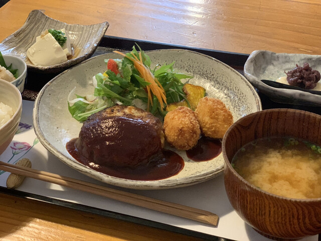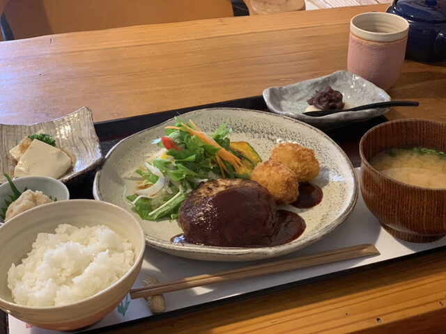 どこでも食べられるものは避けたいんですよね。地産地消でお願いします。豆腐づくしのヘルシー定食にしました。ゆばも入れたら、4種の食べ比べが美味しい。豆腐って偉大ですよね。厚揚げも美味しかった。
