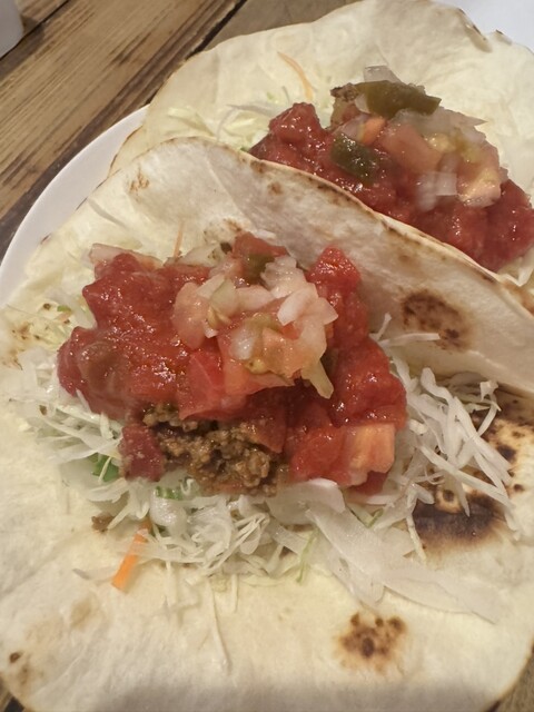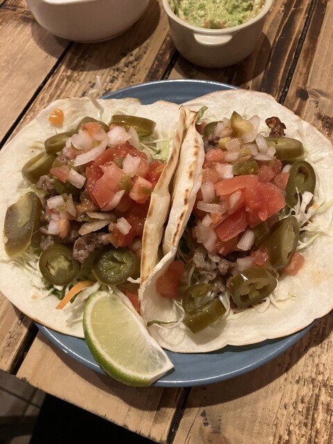 ◎タコスプレート(ひき肉)990円。トルティーヤ(皮)3枚、線キャベツ、チーズスティック、アボガドスライス、サルサ小鉢、トマトソース小鉢、ひき肉そぼろ小鉢、トマト煮込み(唐辛子の辛... 詳細を見る