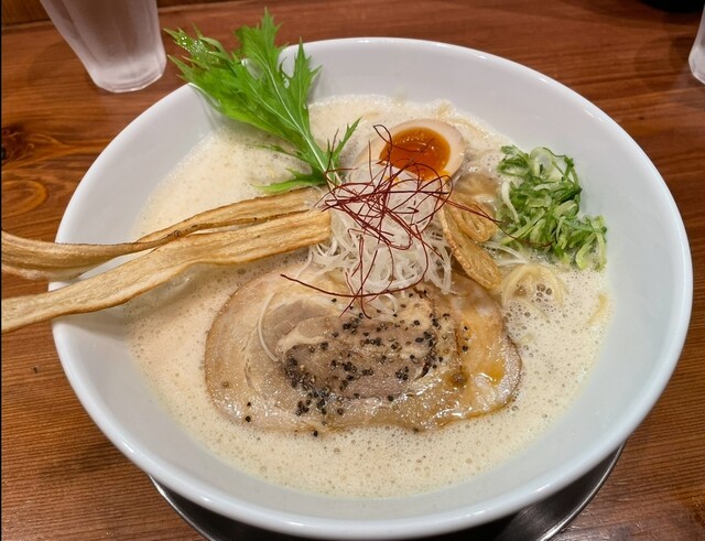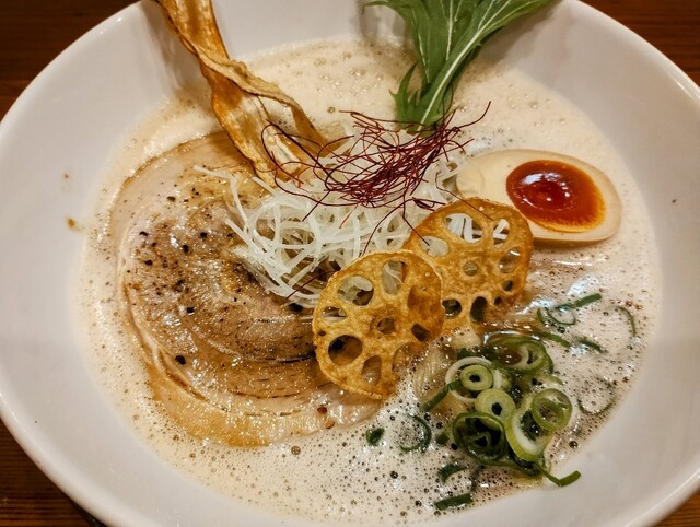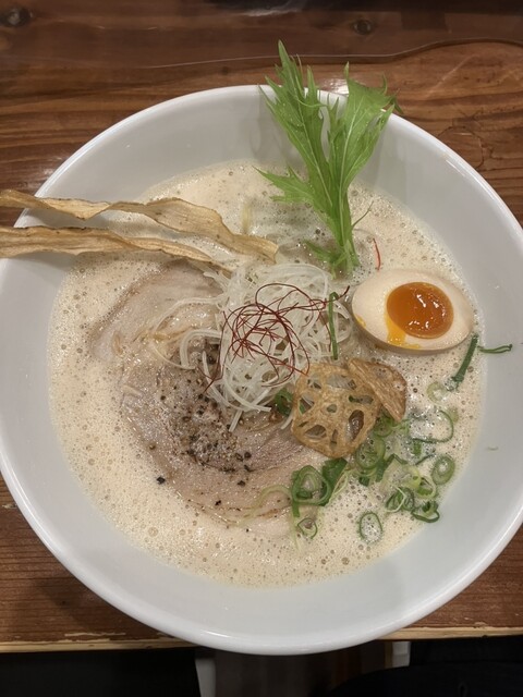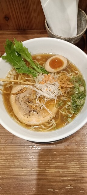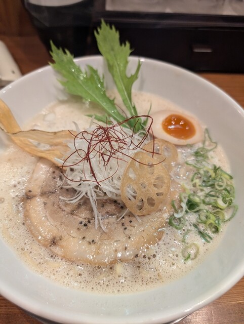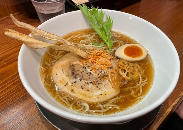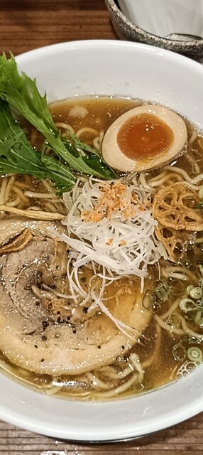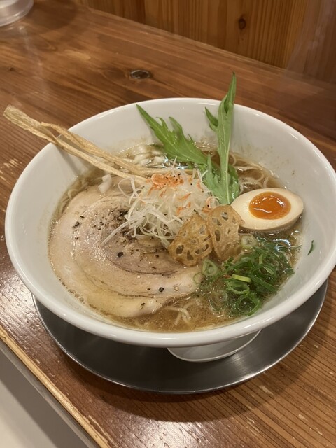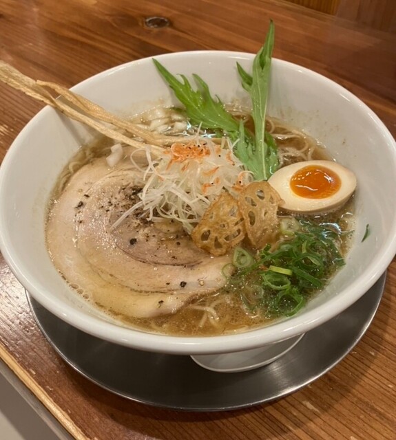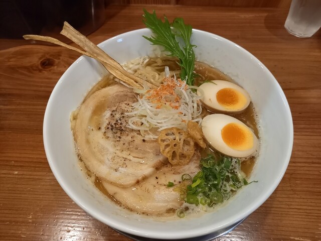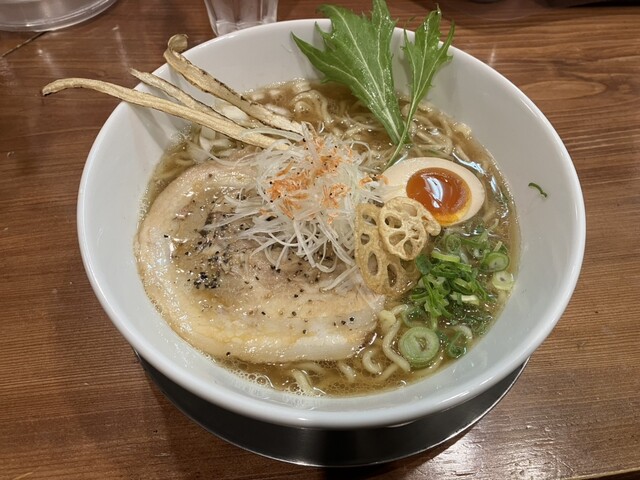 ◎魚だしらぁ麺960円、大盛1000円 チャーシュー1、味玉ハーフ(味が染みてる)、揚げたごぼうスライス、揚げた蓮根スライス、刻みネギ、白髪ネギ、あみえび、みじん切り玉葱、水菜。... 詳細を見る