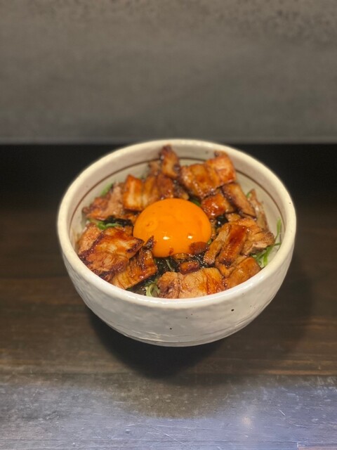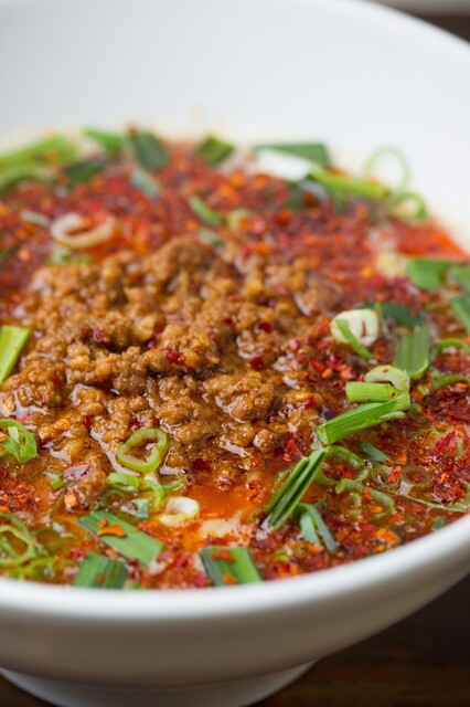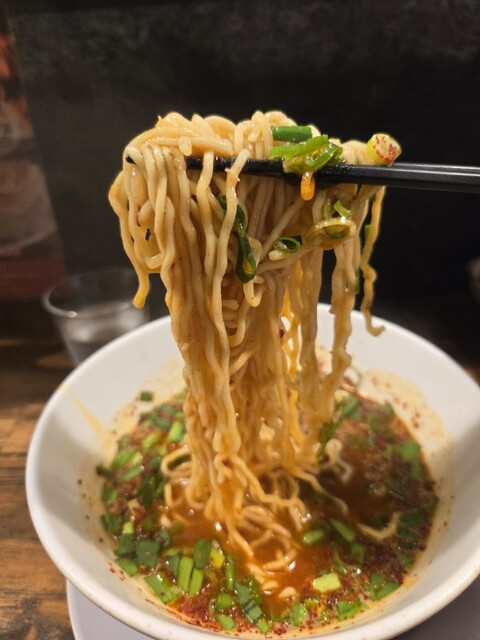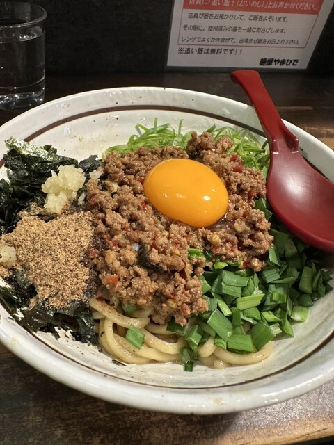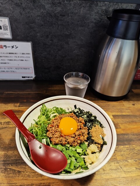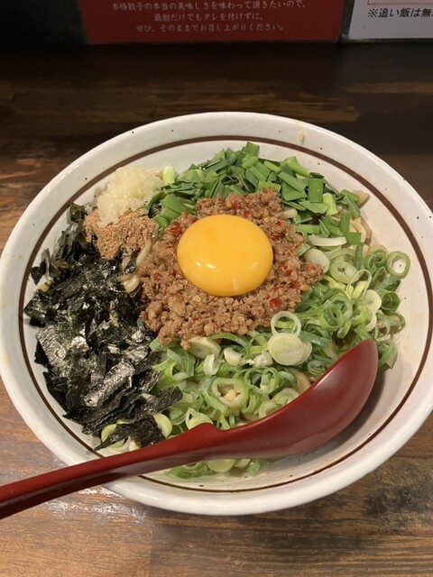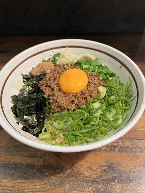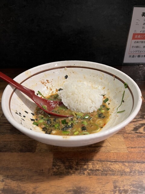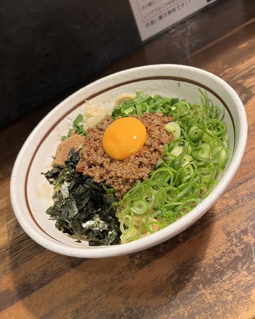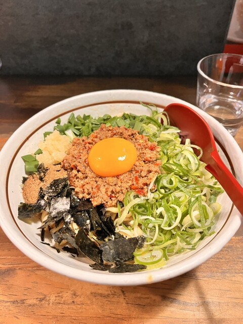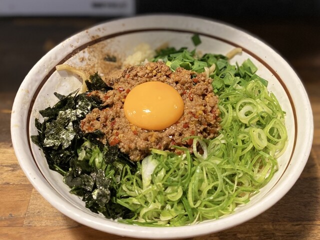 具は唐辛子と炒めた豚挽肉、その上に卵黄、白ネギ、ニラ、刻み海苔、魚粉、ニンニクがのり、麺はタレとの絡みが抜群の専用麺を使用。 豪快に混ぜ合わせて食べます。 残ったスープにご飯を入れて食べる「追い飯」がオススメです。 食べてからわかる渾身の一杯をぜひ!