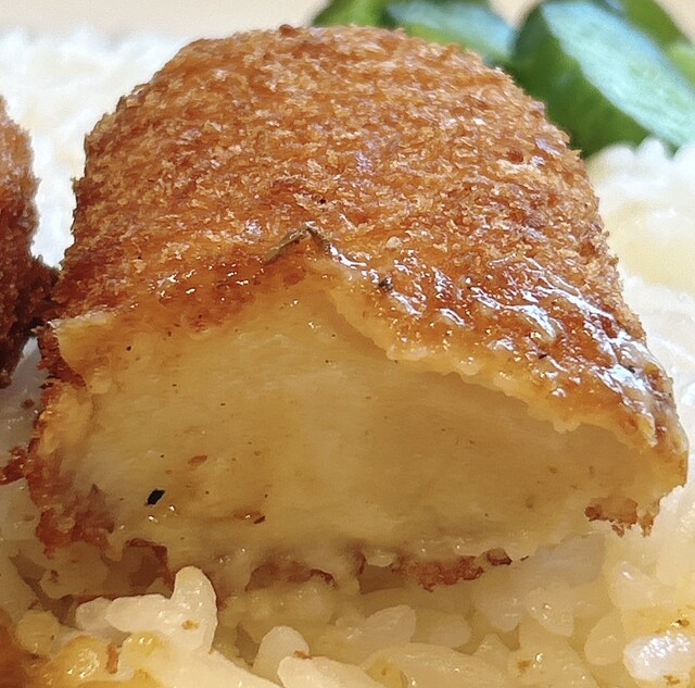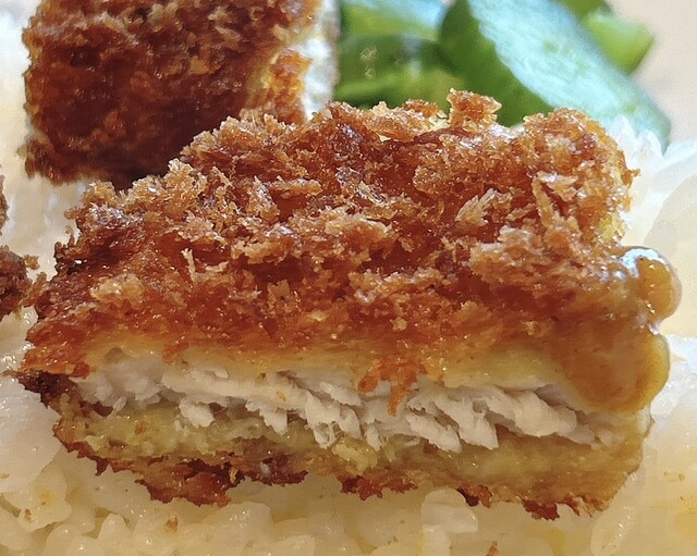 しっかりスパイスが利いたカレーと角切りパイナップルの甘さのコントラストと、スライスココナッツの食感、1枚肉を一口サイズにcutしたチキンフライが旨味充分。