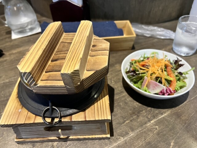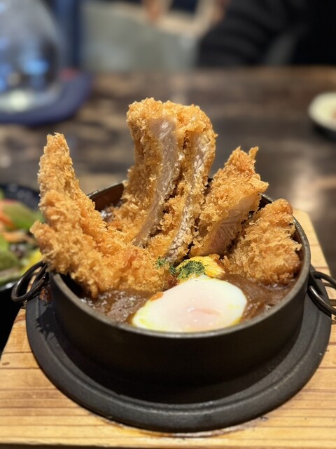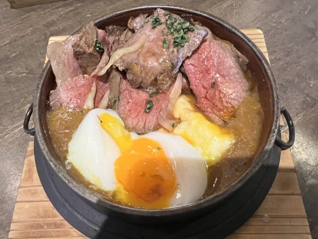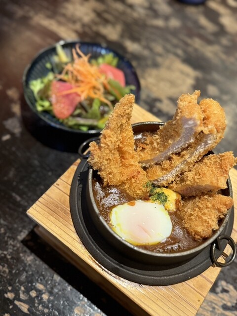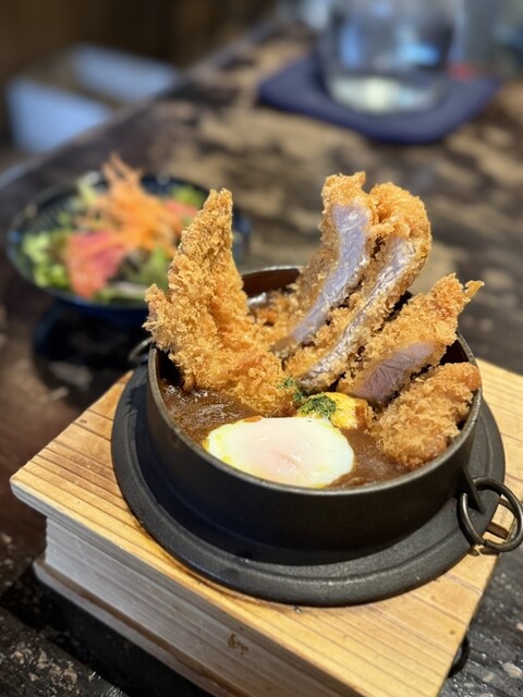 ◎焼きカレー1485円。最初に新鮮&彩りのあるサラダ、自家製のドレッシング。その後、直径15cmほどで深みのある釜にぐつぐつ煮えた焼きカレーが着卓。とろーり半熟卵とチーズ。下に潜る... 詳細を見る