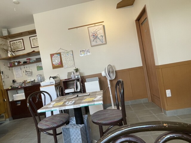 テーブル席2つと壁際のカウンター席がある