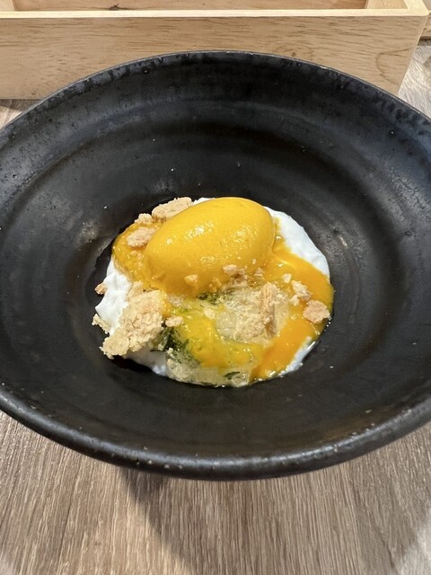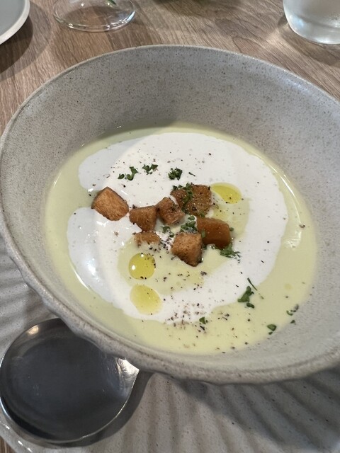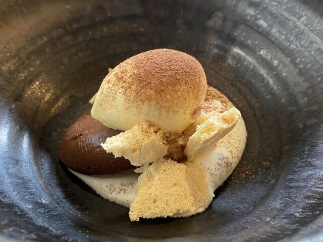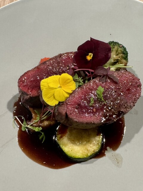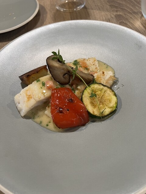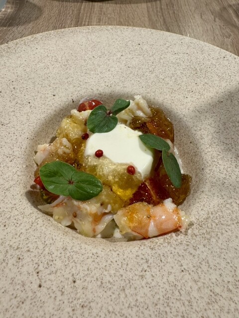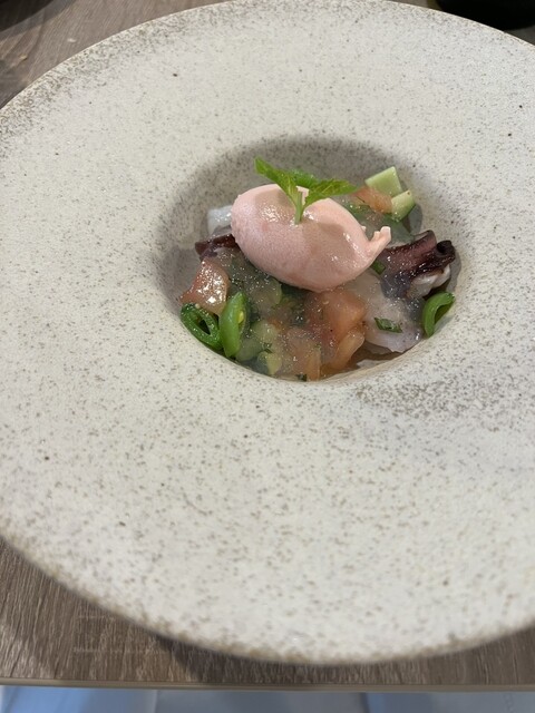 前回美味しかったので、今回は主人と次女と再来店。季節は違えどメインに鹿があって嬉しい❣️ 私と主人は鹿、次女は仔羊を選択。 プーリアのマルヴァジア&ソーヴィニヨンブラン。 トマトのソルベと水蛸、梅酢のジュレ。 塩味を利かせてさっぱりしたビネガー風味は、早くも蒸し暑い日本の初夏に嬉しい... 詳細を見る
