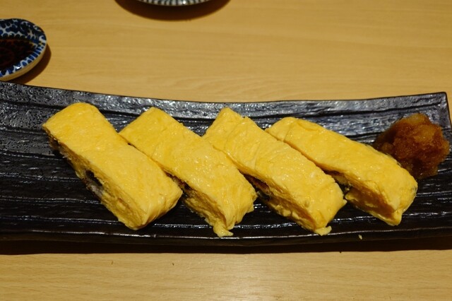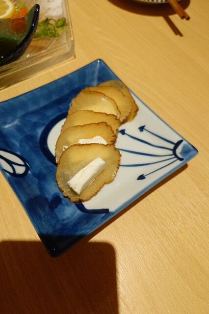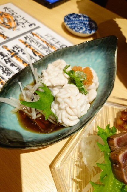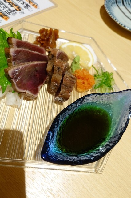 ■本日のおすすめ ◎名物!!鰹の藁焼き1480円 カウンターの奥端の席は、炭火焼と藁焼きの調理ライブ特等席。 藁から煙が出て炎が上がって、鰹のサク(柵)を炙って...口に入れると、この藁の香りが先に鼻に抜けて、鰹の味がやってくる。6切。 薬味は、塩、山葵、もみじおろし、ポン酢。それと、にんに... 詳細を見る