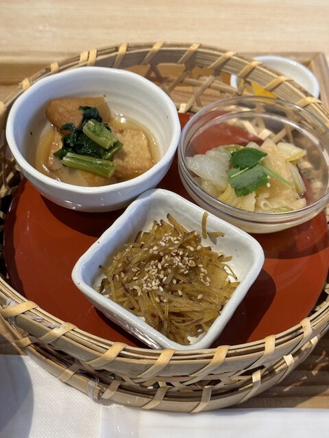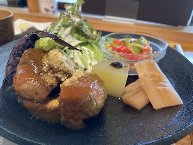 週替わりとれたてランチ1180円(黒米に変更+100円)、この日は◎鶏もも肉のオーブン焼き(たぶん大和肉鶏)すりおろし野菜ソース。○胡麻豆腐、○白ネギお浸しと温玉、◎サラダ、◎揚げ... 詳細を見る