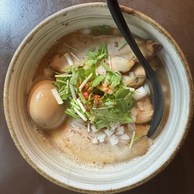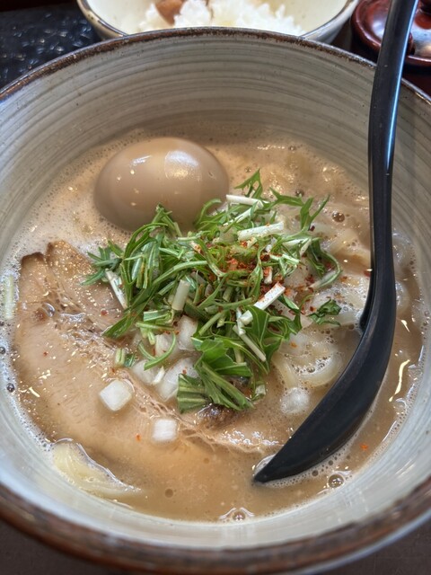 味玉らーめん1150円 行列覚悟だったが、10時40分に着いたら開店していたので入店。 おすすめの味玉らーめんにしてみた。 調理中にブーンと言うモーター音がしたのでエ... 詳細を見る