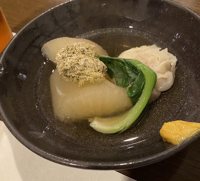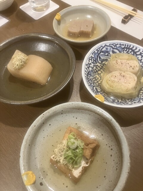 おでん:大根、厚揚げ、ごぼう天といった定番のおでんは、東京のような真っ黒な出汁ではなく、透き通ったお出汁です。味は濃くはありませんが、良いお出汁です。なお、椎茸は薄切りにしたスープ...