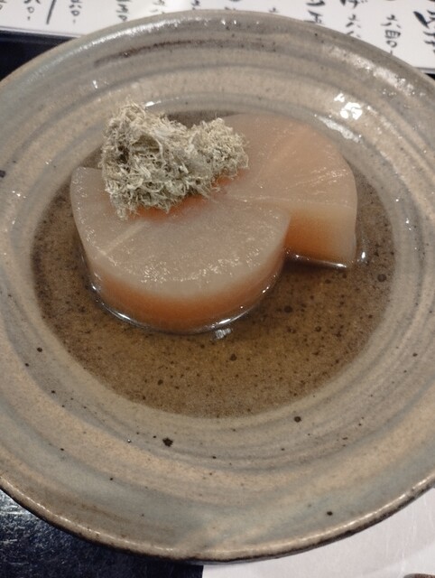 楽しみだったおでんを注文。大根、たまご、白滝、焼き餅。大根は二日くらいかけていると思われる。薄いお出汁で...