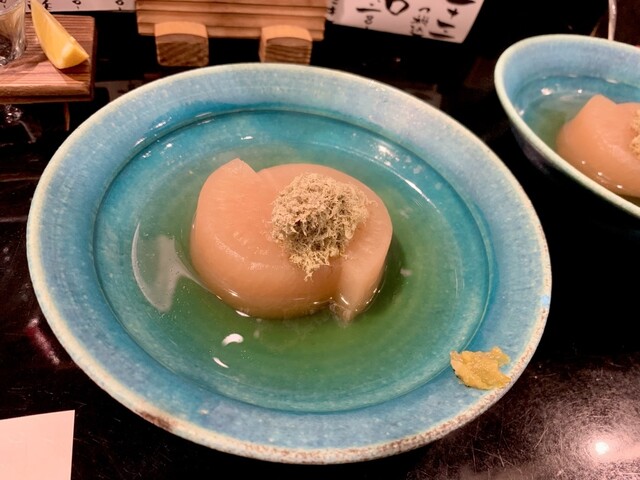 すぎ乃のおでんは種類ごと個別にお皿に盛られていて上品♪具材ひとつひとつに愛とリスペクトを感じます。お出しが染み込んだ大根には、とろろ昆布がトッピング。半熟卵のおでんにはイクラが乗っています。しかもイク...