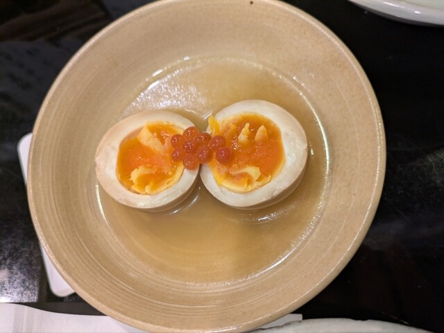 そして卵は半熟で2つに割られて、上にいくらが添えられています