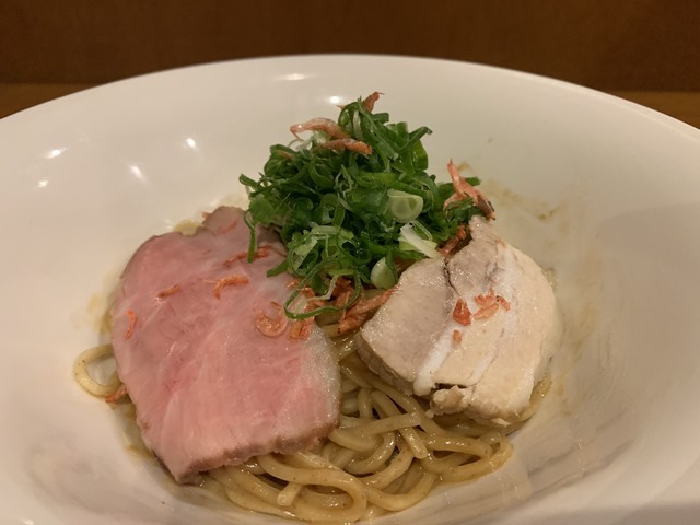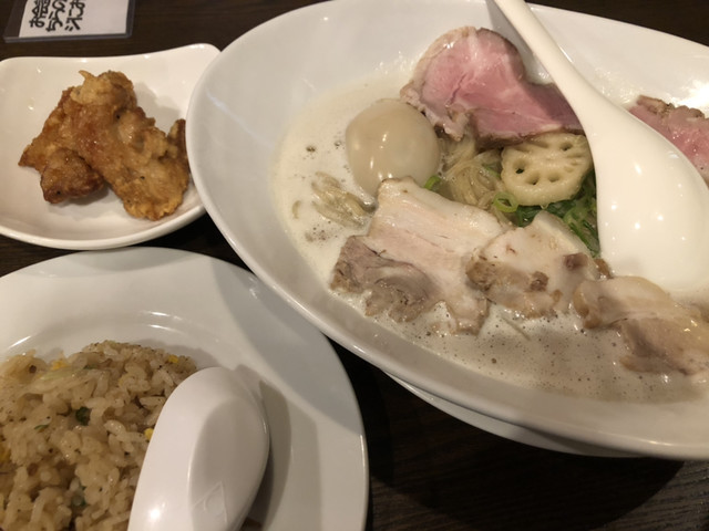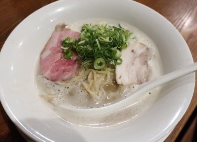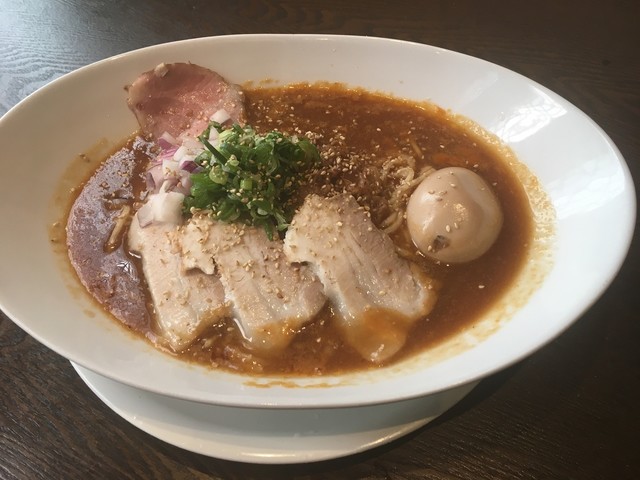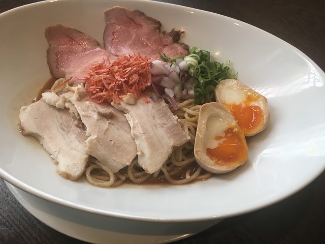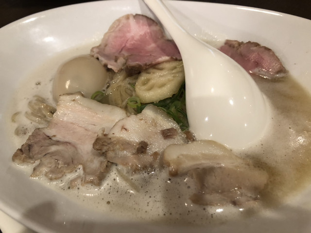 モチモチ食感の全粒粉入り太麺×スペイン産の栗を食べさせて育てた栗豚のレアチャーシュー豚ばら肉のトロトロチャーシューのWチャーシューがのった[魚介鶏豚骨らぁめん]、レアチャーシューが2倍、トロトロチャーシューが3倍、半熟味玉子がのったお得な[特製魚介鶏豚骨らぁめん]を是非ご賞味下さい。
