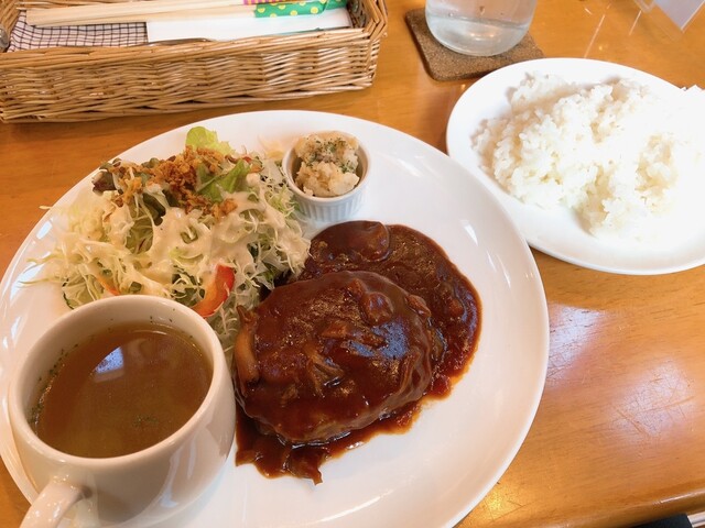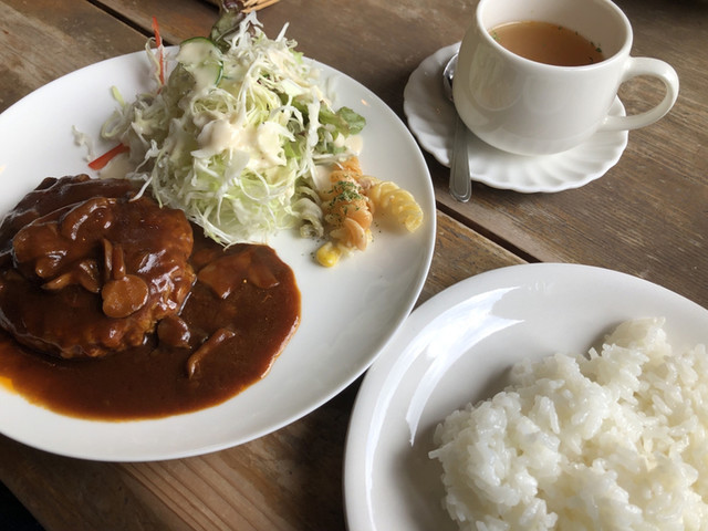 雰囲気のよい喫茶店。ランチにハンバーグをいただきました。分厚いハンバーグの上にはジンジャーソースがたっぷり。肉汁いっぱいのハンバーグに、ジンジャーソースのすっきりしたテイストがあっていておいしかったです。