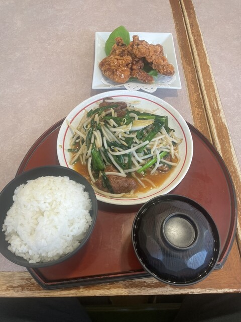 ご飯が新米と掲示されているので、ご飯が進むレバニラ定食と唐揚げを注文。