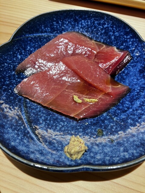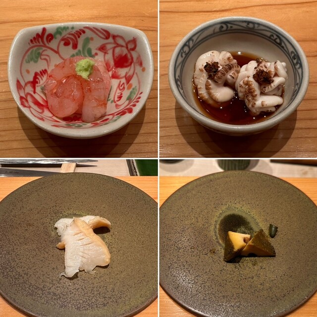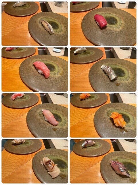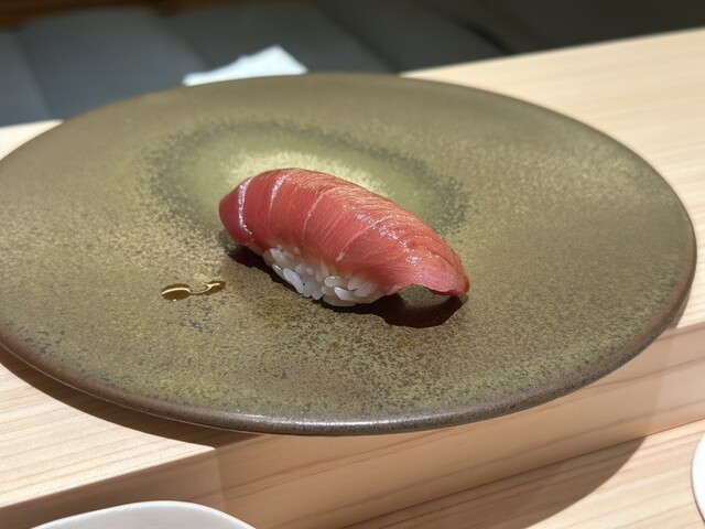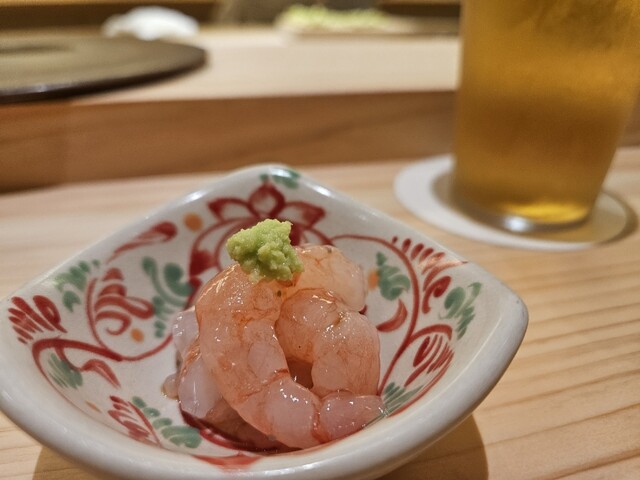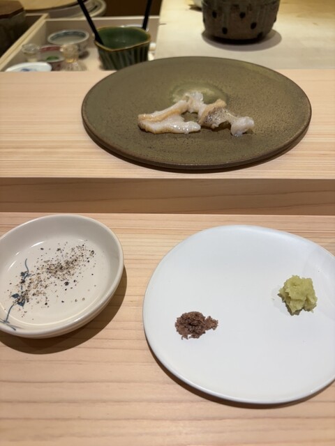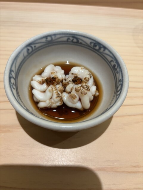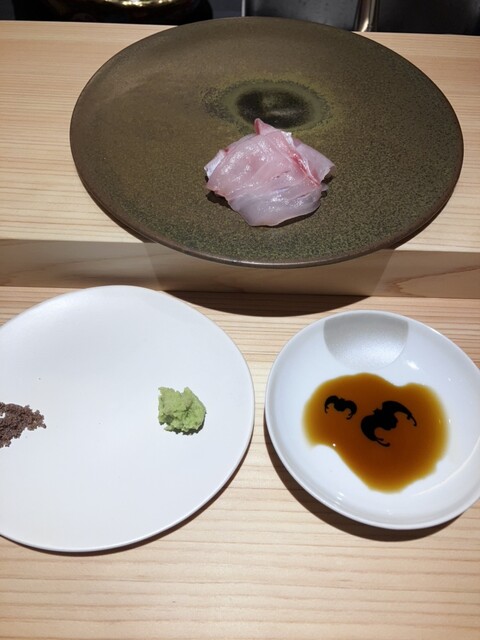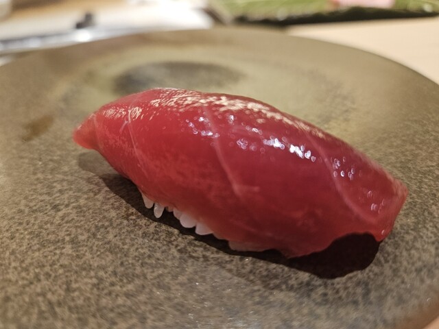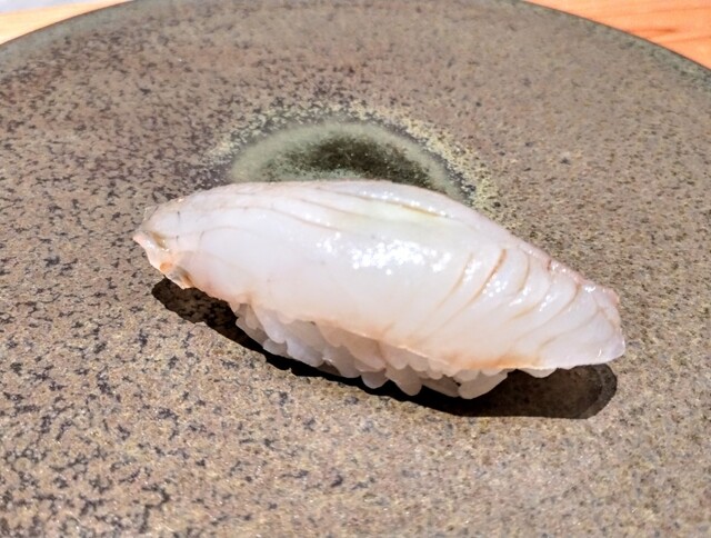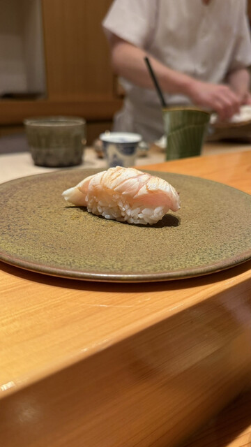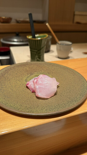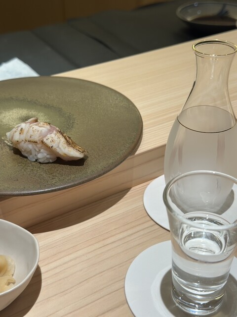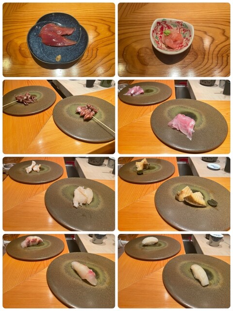 最初に数品のツマミを出してから握ります。シャリは私の好みに合わせてマイルドな酢の効き方でした。薄切りのガリは酸味が控えめで、山葵と藻塩だけでも十分な美味しさです。この日はツマミが6品、握りが12品で、...