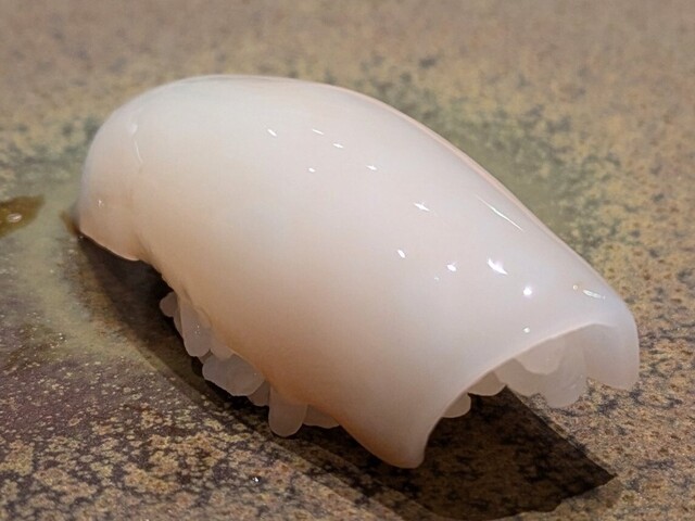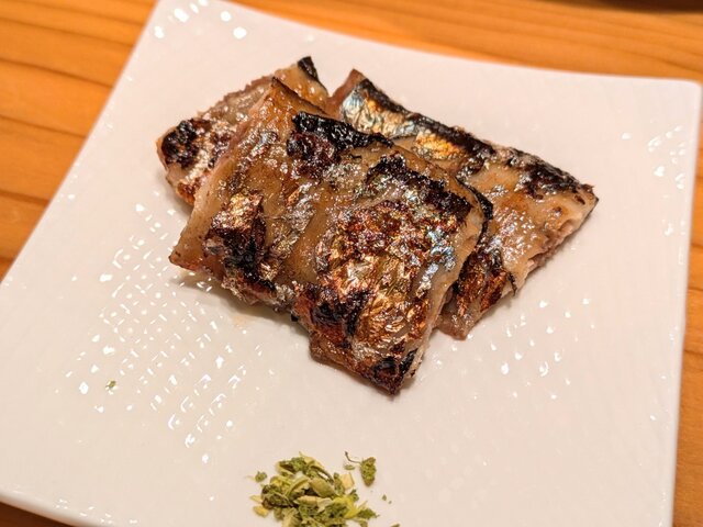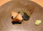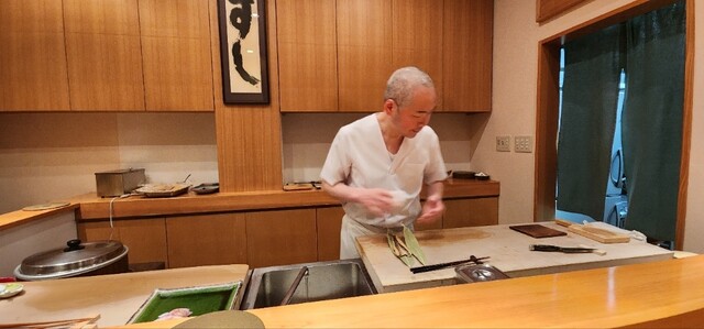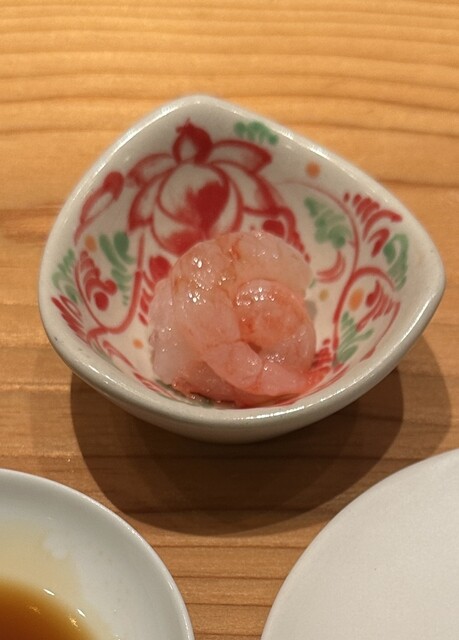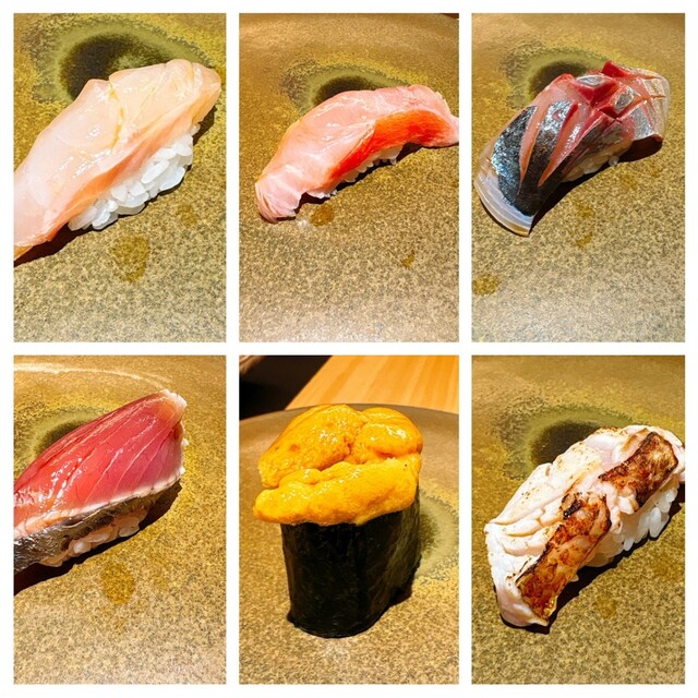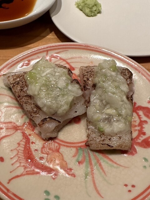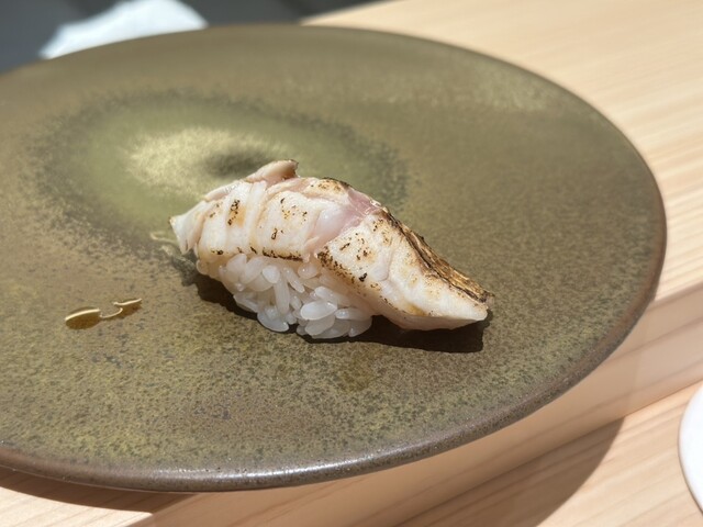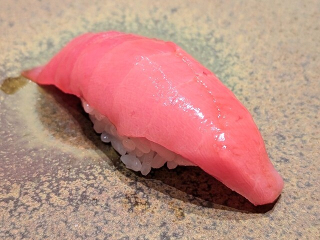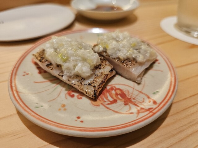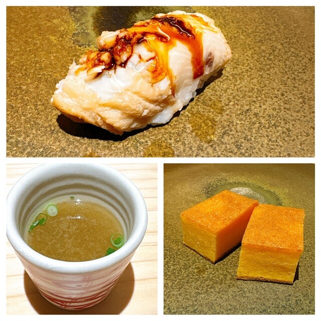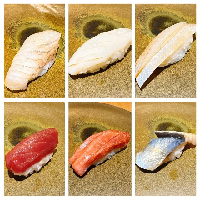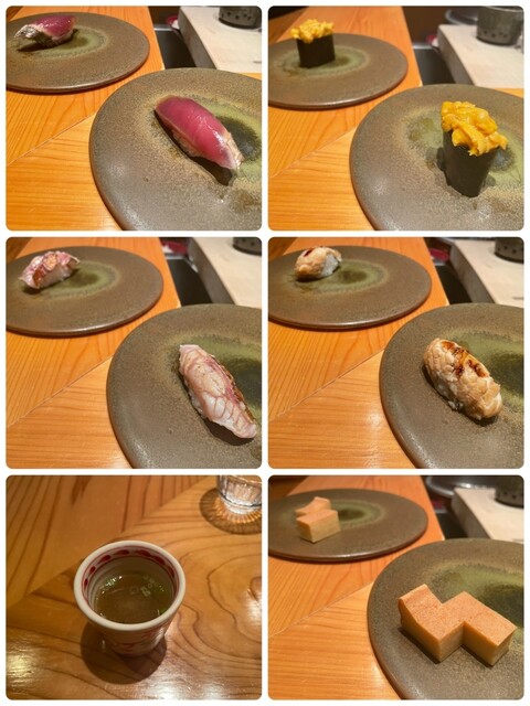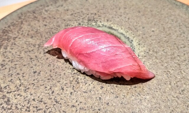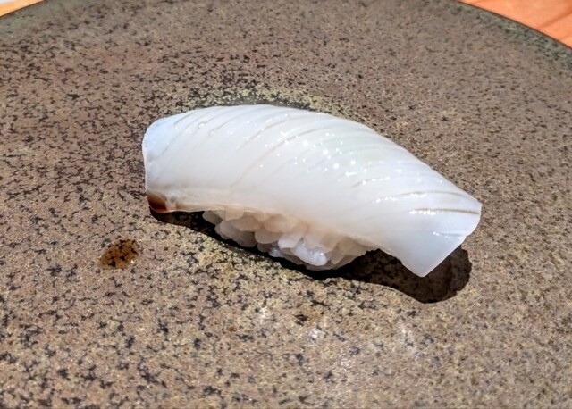 最初に数品のツマミを出してから握ります。シャリは私の好みに合わせてマイルドな酢の効き方でした。薄切りのガリは酸味が控えめで、山葵と藻塩だけでも十分な美味しさです。この日はツマミが6品、握りが12品で、...