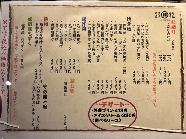 味は普通 佐渡特産のネタをいくつかいただいたが驚くほど美味しいというわけもない。