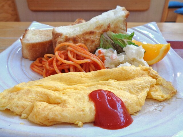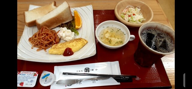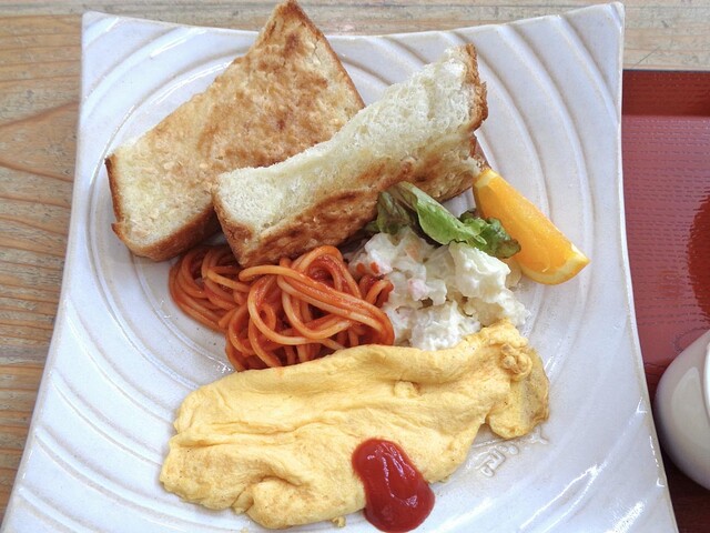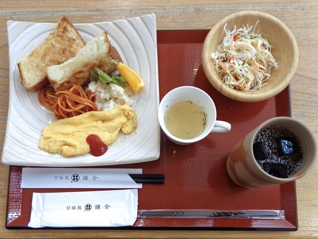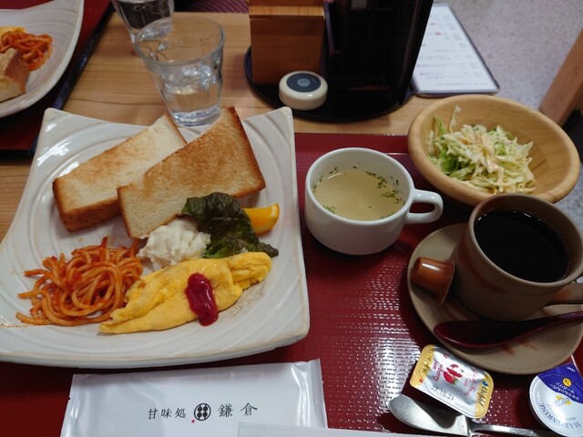 トースト、ミニサラダ、スープ、オムレツ、ナポリタン、飲み物でとってもお得感ありでし...