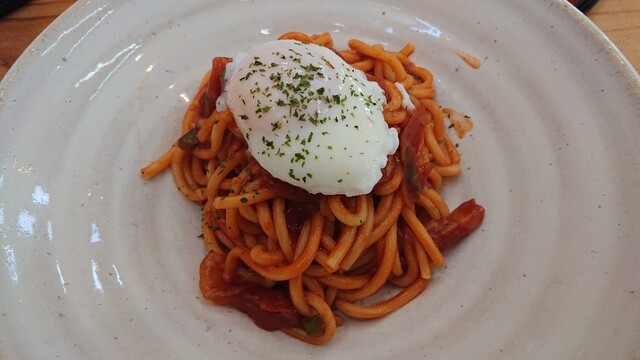 ナポリタンは麺が太くモチモチしていて美味しかったです。玉ねぎ・ベーコン・ピーマン・半熟卵が入っていました。