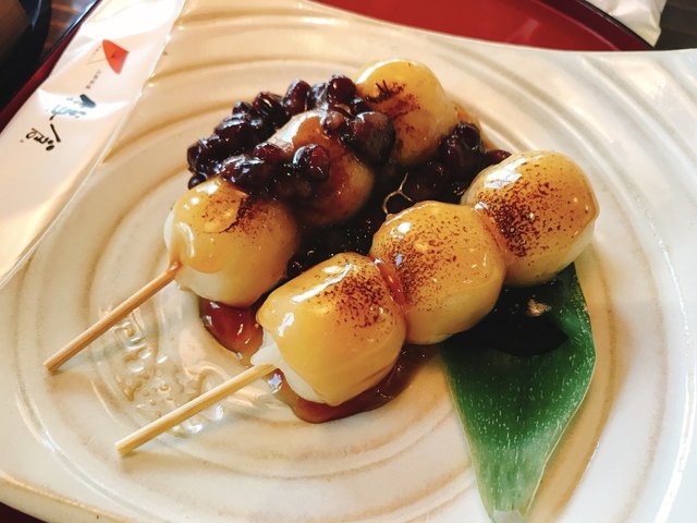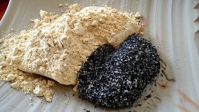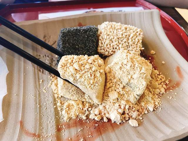 黒蜜きなこのかき氷にわらび餅をトッピングです。