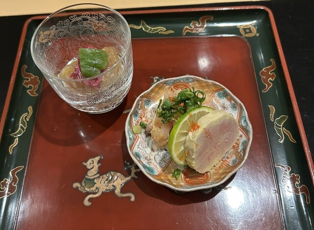 南蛮海老の味噌乗せとフォアグラの味噌漬けは酒泥棒当確な味わいで、村上の塩を振ったアラやコチの昆布締めは魚の練れた旨み全開で、鮎焼きは鮎のカリサクでサクふわな食感と茄子のもった...