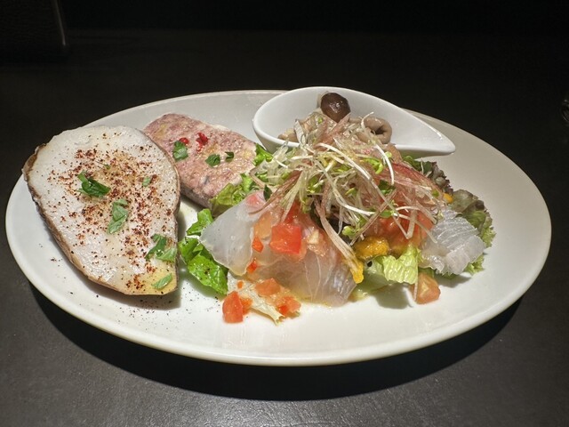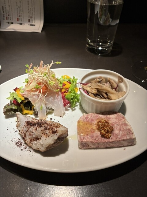 アミューズから始まり、カンパーニュ、カルパッチョ、マリネ、キッシュなどがのっ...