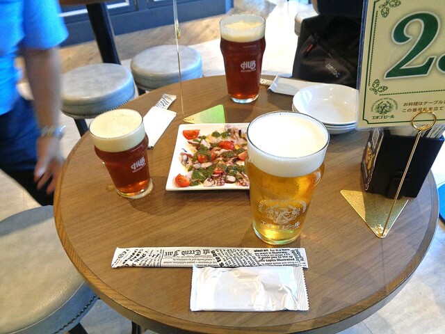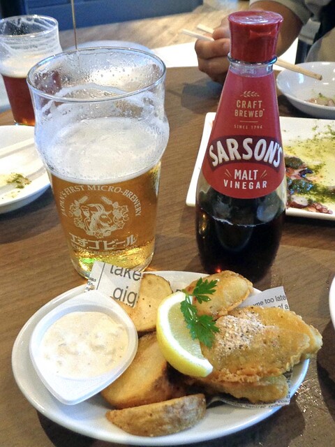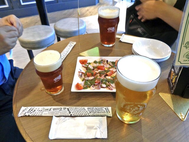 客人達は,「レッドドラゴンIPA(期間限定)」の「1パイント 950円(ハッピーアワーは900円」や「1/2パイント 500円」,「ひとくちフィッシュ&チップス(4ピース)440円」,「タコパッチョ 550円」等を注文していました(いずれも税込).