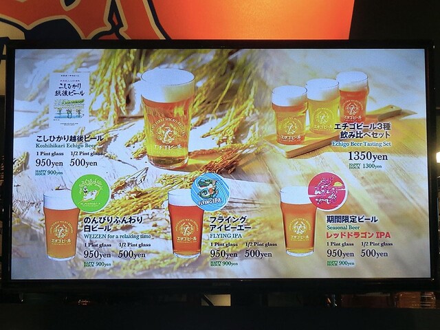 自分は,「ハッピーアワー 1,050円セット(税込)」を注文してみました.これは19時までのオトクなセットで,『エチゴビール』1パイント(4種類から1種類選択)と,ツマミ(7種類から1種類選択)の組み合わせです.自分は,「こしひかり越後ビール」と「ひとくちフィッシュ&チップス(4ピース)」を選択しました.