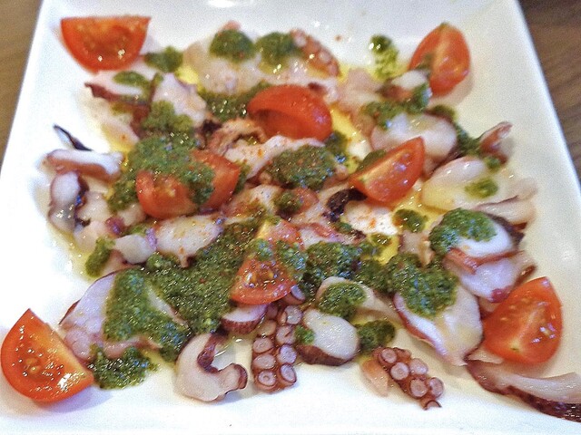 連れが注文した「タコパッチョ」は,なかなかのボリュームです.薄切りの茹でダコと,ミニトマトに,バジルソースがかかっていました.タコの食感と旨み,そしてバジルの風味が,ビールと好相性でしたね.