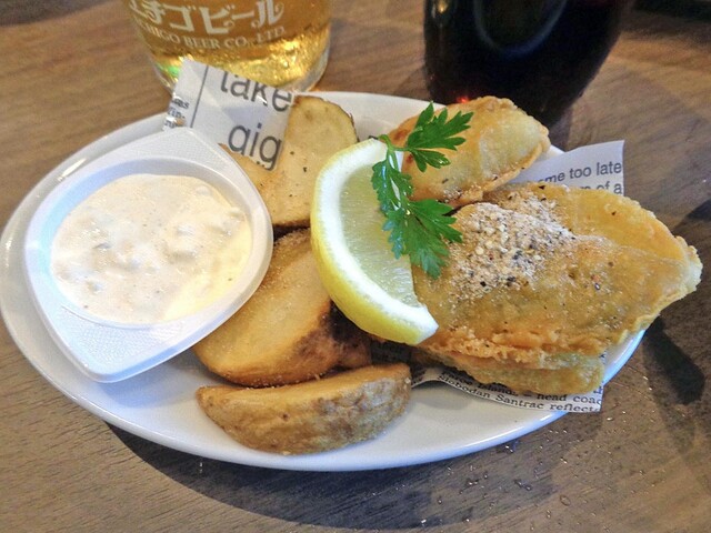 白身魚は,ころもザクザクで,身はシットリ・ホクホクです.塩・コショウがかかっているので,そのままで十分イケますね.とはいえ,レモン,モルトビネガー,タルタルソースも良く合いました.