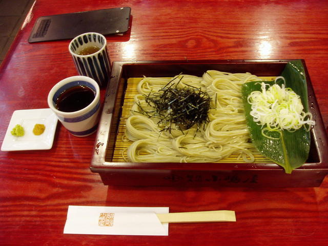おそばはその場で打ったものではありませんが、乾麺ではなく生そばを使用しています。(お土産に生そばを買って帰ろうとしたのですが、消費期限が5日しかないのであきらめました。)おそばを見ると、どことなく緑がかった色をしています(写真参照)。つなぎにふのりという海草を使っているからだそうです。おそばを含んだとたんに海の香りが口の中に広がりました。私には海の香りが強くてそばの香りはあまり感じられなかったような気がします。おそばはもちもちと弾力があるのだけどそれ以上につるつるとしていて、あっという間に喉の奥に入っていきました。つゆは醤油の味がきつすぎず、鰹節のだしがよく効いています。上等の鰹節を使っている様に感じました。薬味にはわざびと和からしが出ました。今はわさびの調子が悪くて生わさびを卸すサービスができないとメニューに書いてありました(2008年6月)。