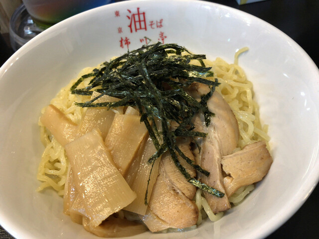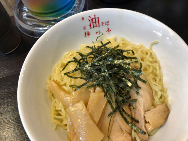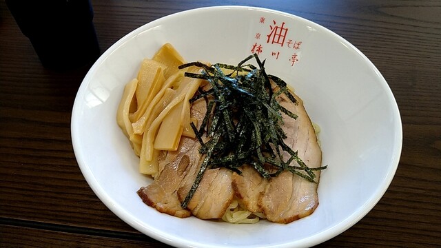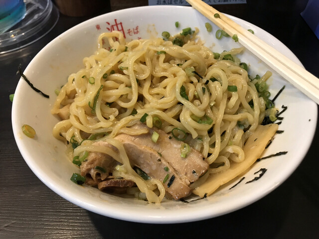 焼豚油そば大盛・細麺、半熟卵、葱胡麻といつものパターン。