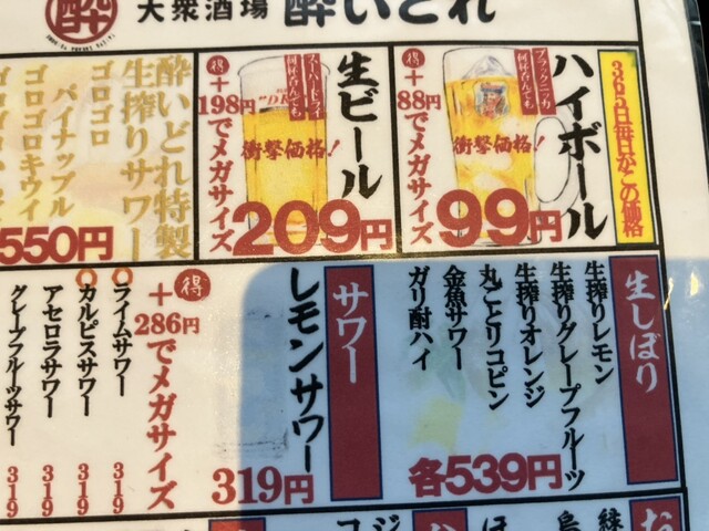 ということで生ビール1つ209円とハイボール2つ99円✖️2で注文して30分で帰りました。
