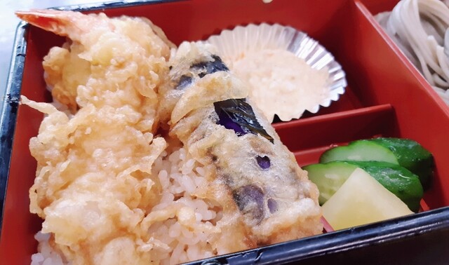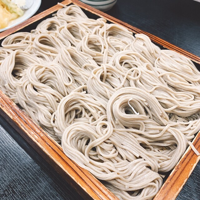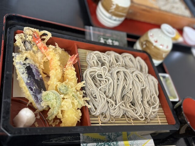 天ざるはこごみ、舞茸、茄子、さつまいも、海老2尾の天ぷらと、ツルッとした喉越しがよい蕎麦です。刻み海苔もついて、ボリュームもお値段も満足でした。