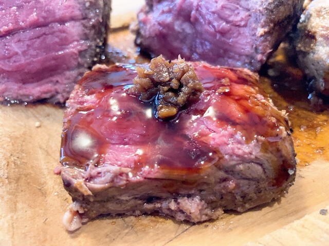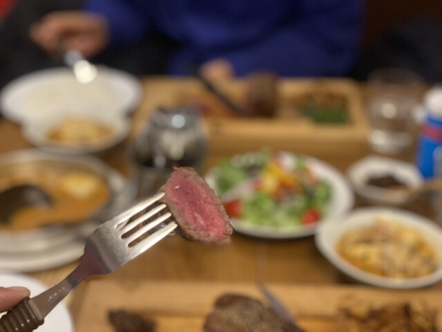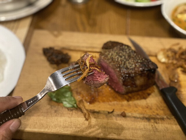 250gの赤身肉がまな板のような皿に盛られていて迫力十分。