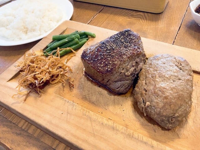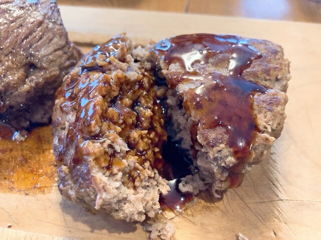 ボンバーステーキ250gとハンバーグ200gが一緒になった欲張りなセット。