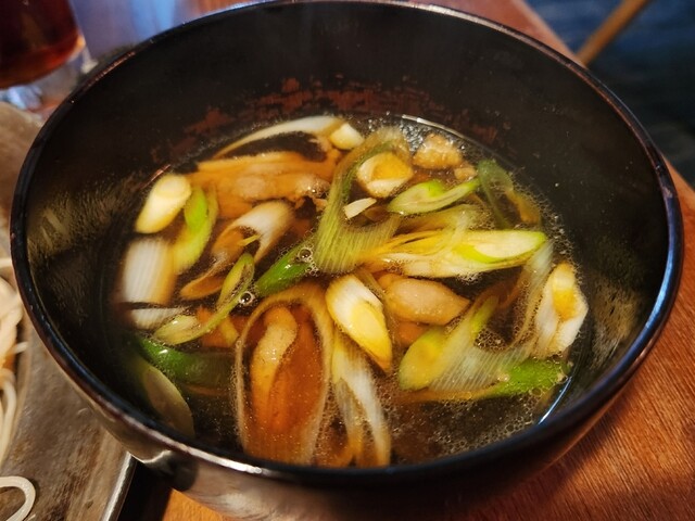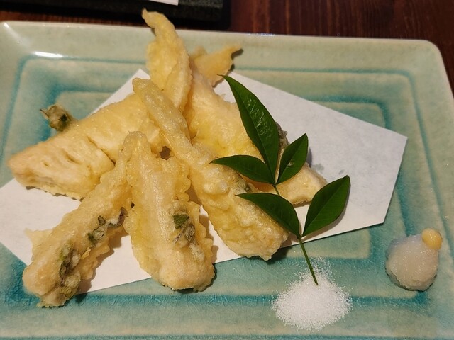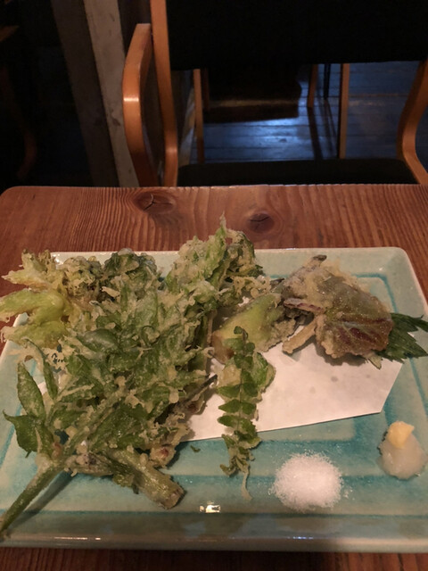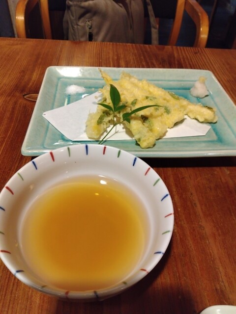 まずは、だし巻きと筍の天ぷらを肴に日本酒を頂きます。筍はその日採ったものだそうで、やわらかい穂先の歯ごたえと衣に混ぜてる葉っぱの苦みがマッチして美味しかったです。シメはなめこおろし(冷)。3品全部についてた大根おろしは全部辛味大根だったようでしかもかなりの激辛。好きな人には堪らないと思いますが、天つゆには合わないのではと...