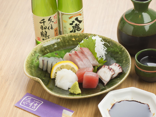 JR大分駅・府内中央口から徒歩10分の場所にある【呑ん気や信】。明るい色調で木の温もりを感じる店内は、座敷やカウンターを含む全席が掘りごたつなので、足を伸ばしてゆったりとくつろげます。カウンターは店主やスタッフとの距離が近く、お客と談笑することの多い和やかな席。広い座敷の一角に並んでいるボトルの多さは常連客に愛されるお店の証でもあります。大分ではあまり流通していないような、新鮮な生の馬肉を堪能する...『馬刺し盛り合わせ』や、その日に仕入れた鮮魚を使用した『刺身の盛り合わせ』、大分名物『とり天』などがおススメです。アットホームな雰囲気なので一人でも気軽に利用でき、友人や仲間とも親睦を深めやすいお店です。