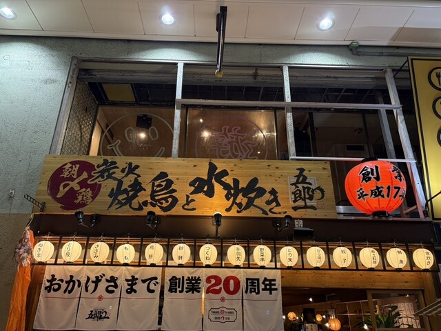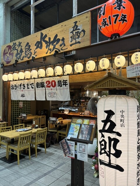大分市の竹町商店街にある炭火焼鳥の「五郎一」に二次会で立ち寄り。こちら創業20年を迎え市内で数店舗展開するその本店です。店内は開放的な空間でお客もたくさん。