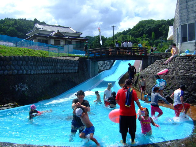地形を活かしたすべり台もあり。中州部分に更衣室完備。